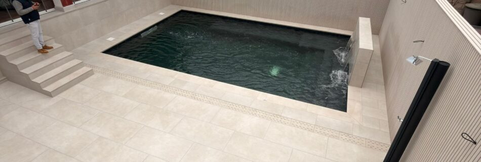 Rehabilitación de piscina con lámina armada RENOLIT ALKORPLAN TOUCH Elegance. Solado y doble cascada de Cerámica Mayor, ademas de instalación de Turbina de nado contracorriente de BINDER.