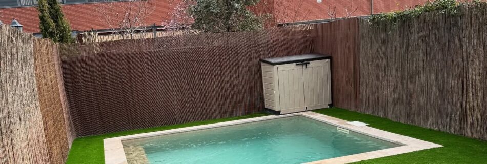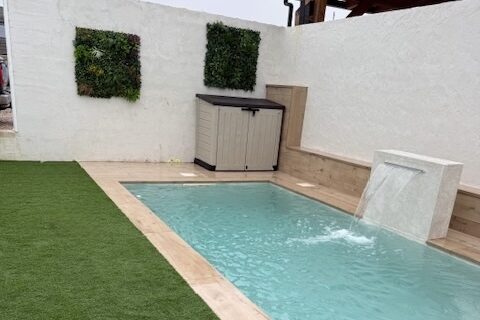 Mini piscina con lámina armada RENOLIT ALKORPLAN TOUCH Prestige y entorno con solado porcelánico de Cerámica Mayor y césped artificial de Verde Ibérica. La Obra:
